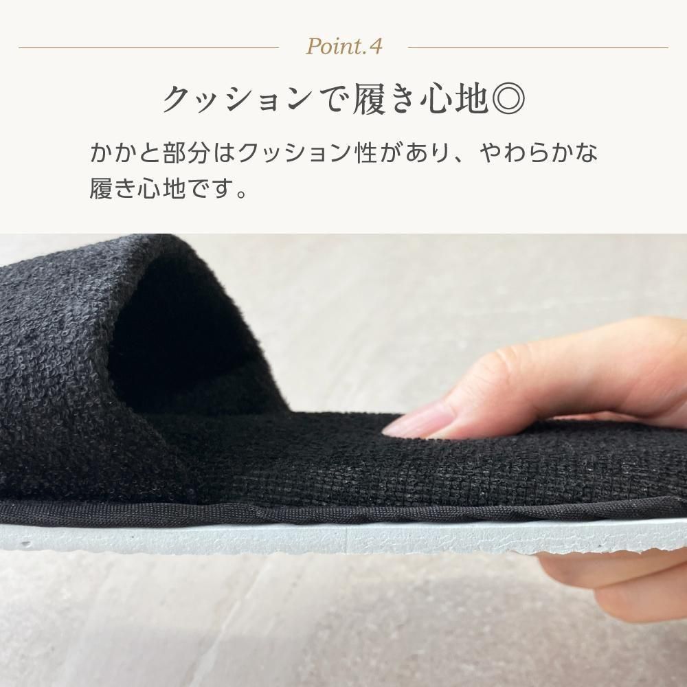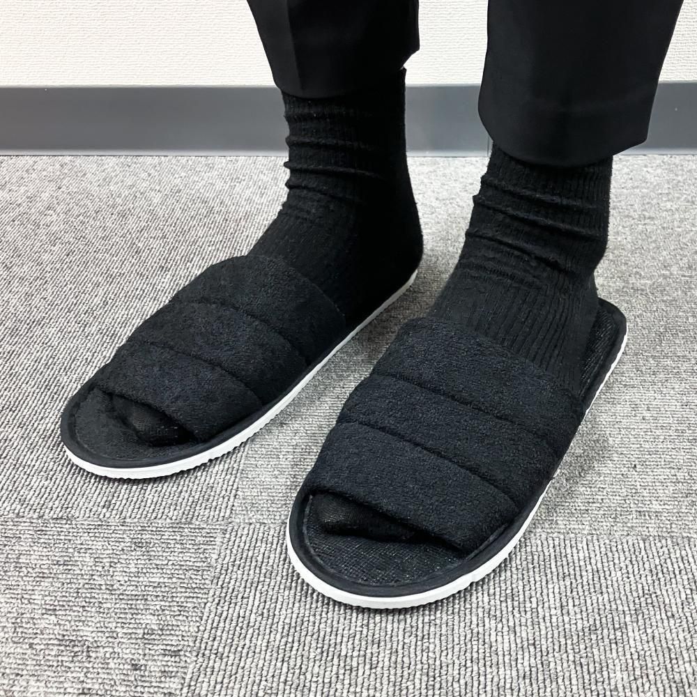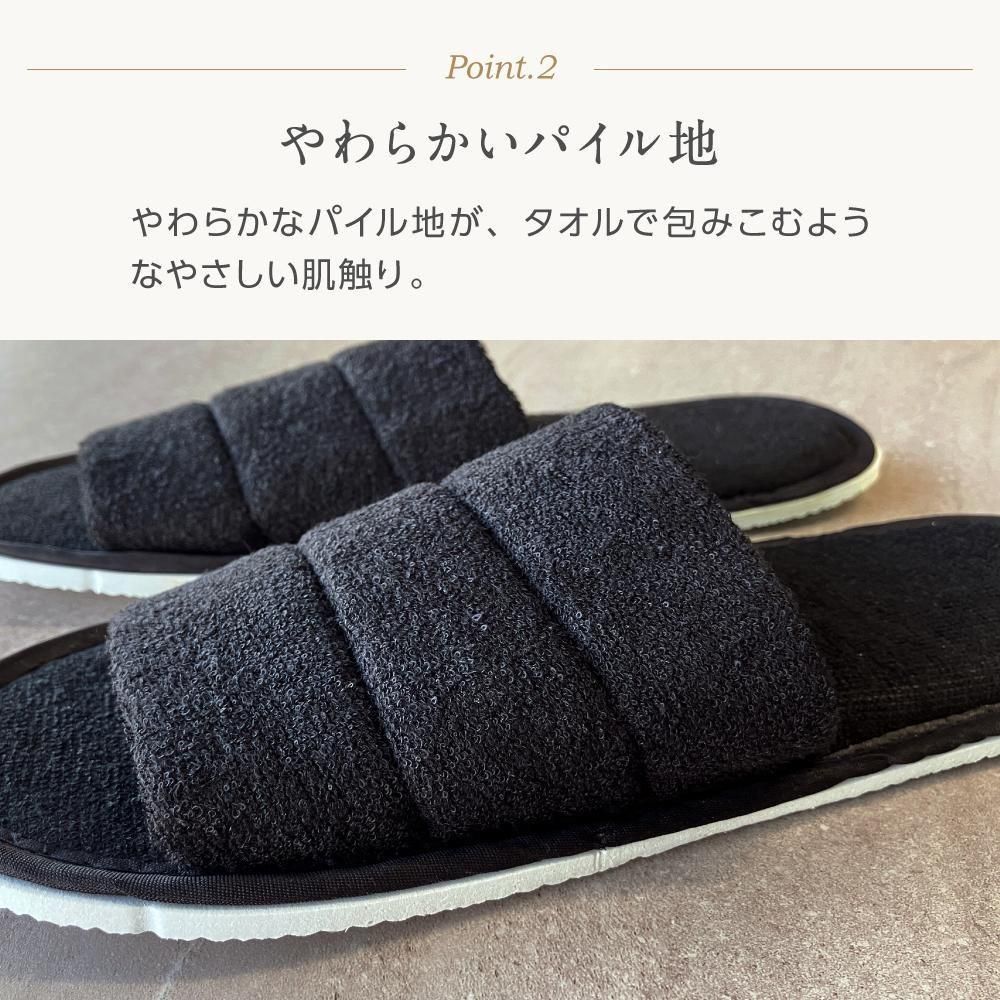 ふわふわの肌触りが心地良いパイル地タイプのスリッパ。シックで落ち着いた印象を与えてくれる黒をご用意。しっかりと厚みのある底で、足の疲れを和らげます。