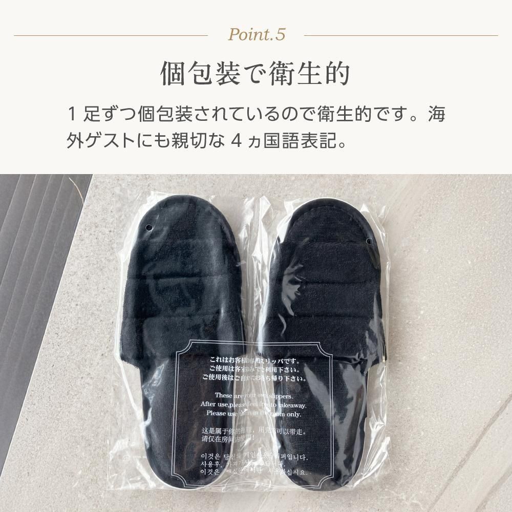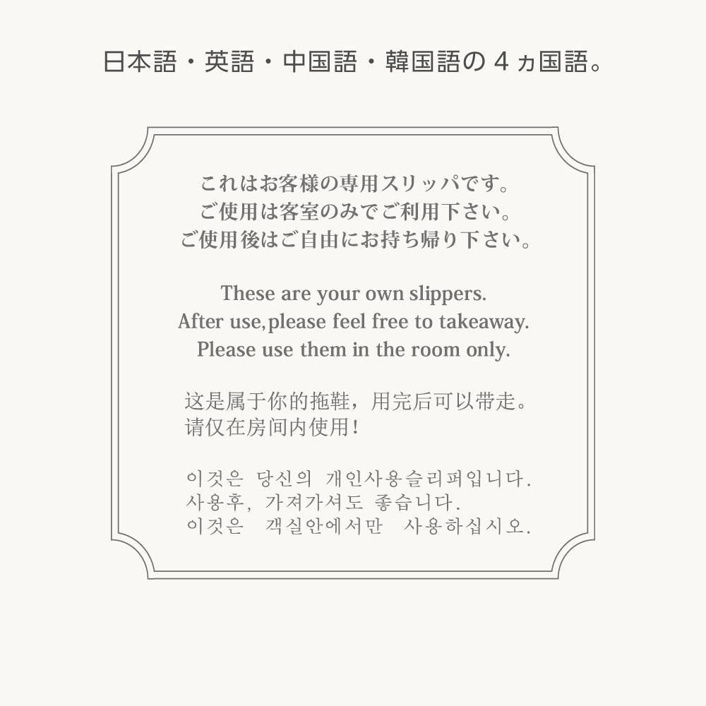 パイル地に厚めの底で履き心地のよい前開きスリッパ 1足ずつ個包装で4ヶ国語表記
