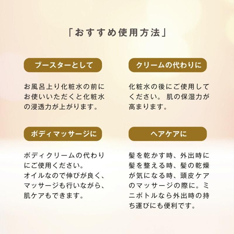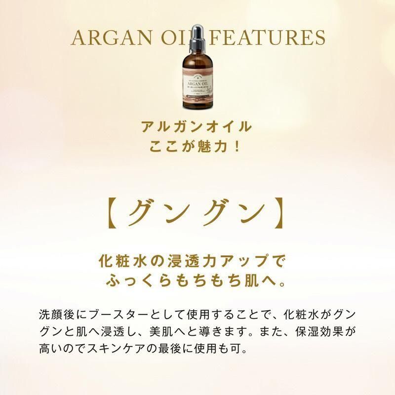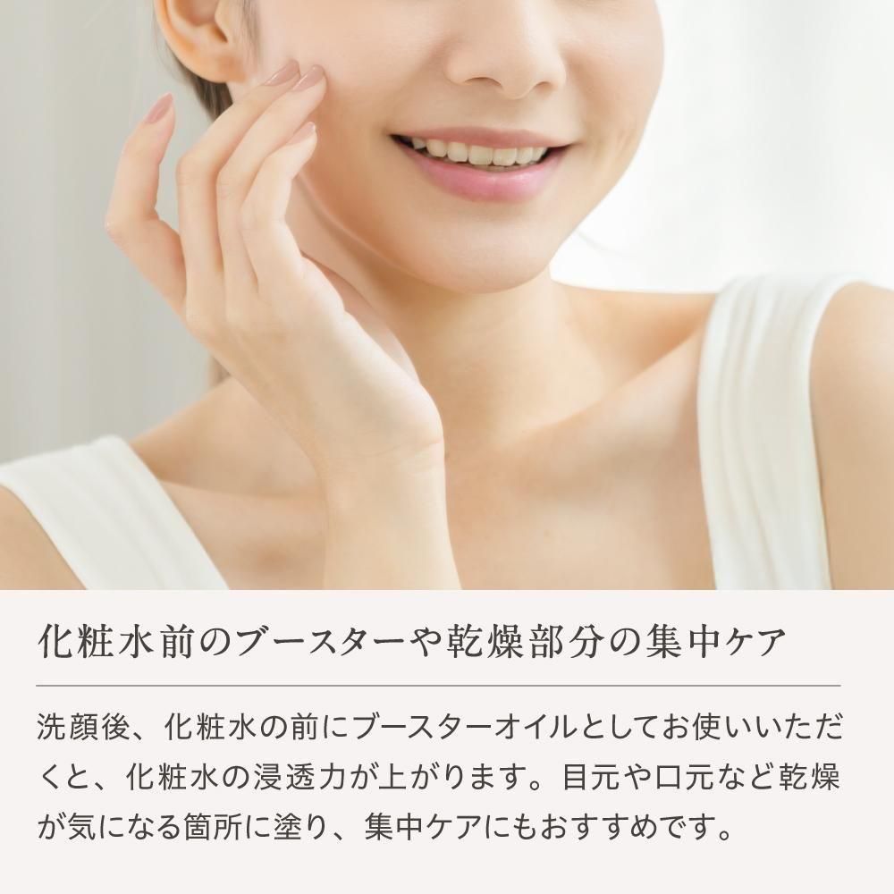 洗顔後、すぐに少量(少しでよくのび、なじむ)を顔全体になじませてから化粧水→乳液など使い方は色々。 化粧水と混ぜて使ってもいいですよ。 洗顔のあとにブースターとして化粧水の前に使うことで、化粧水などの有効成分を吸収しやすくさせます。 ベタつかず、軽くさらっとした使い心地で肌にすぐ浸透し、水分と油分のバランスを整えてくれるので、 気になる皮脂を抑えながら、欲しい潤いだけをしっかりキープします。 アルガンオイルは抗酸化作用の強いオイルなので、サンオイルのような油焼けの心配がありません。 日焼け止めSPF5-9の紫外線防止効果があります。(簡易的な日焼け止め)