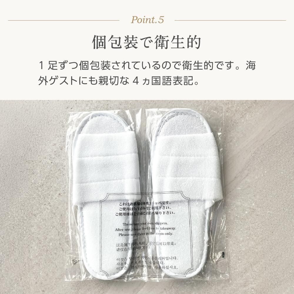 パイル地に厚めの底で履き心地のよい前開きスリッパ 1足ずつ個包装で4ヶ国語表記
