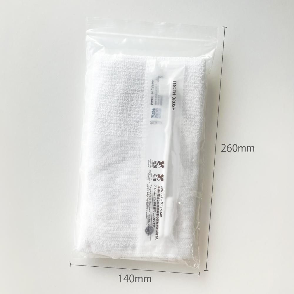 白タオル140匁と歯ブラシが透明ZIP袋に入ったセットです