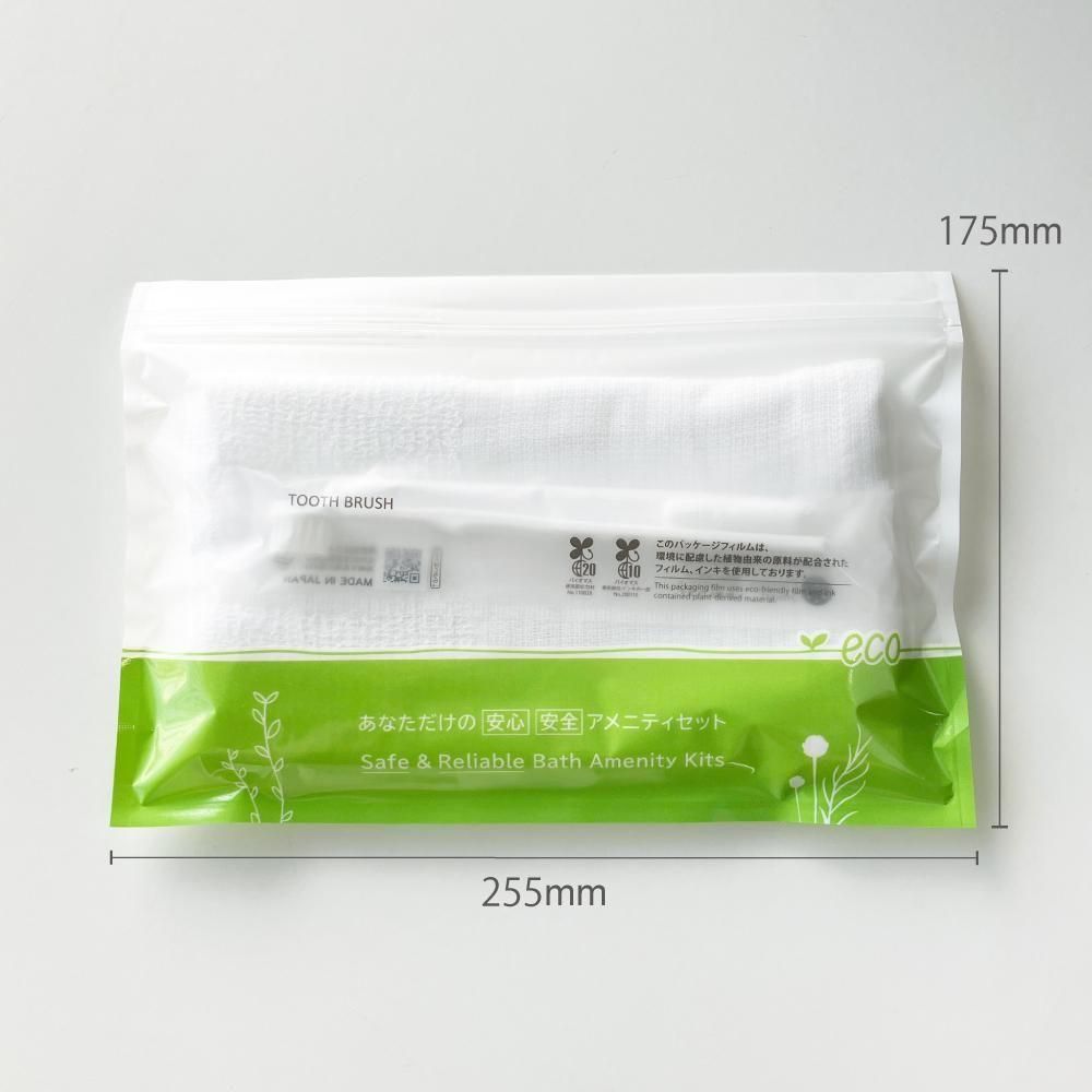 白タオル140匁と歯ブラシがアメニティZIP袋に入ったセットです