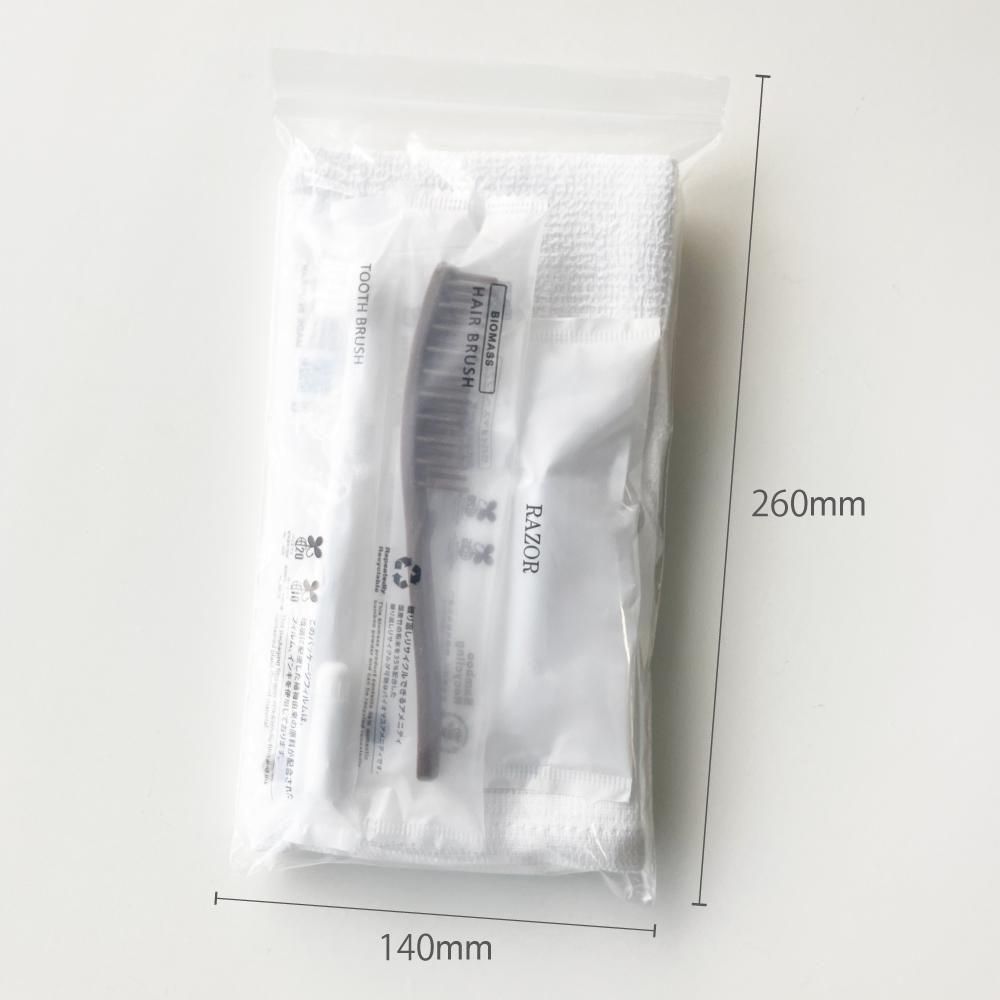 白タオル160匁と歯ブラシ、ヘアブラシ、カミソリが透明ZIP袋に入ったセットです