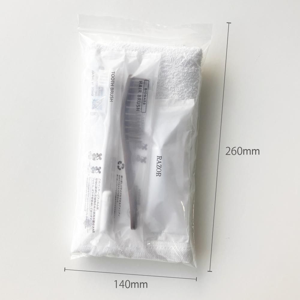 白タオル180匁と歯ブラシ、ヘアブラシ、カミソリが透明ZIP袋に入ったセットです